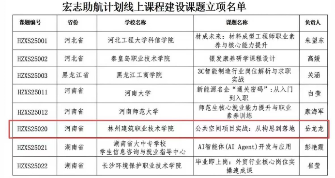 近日,教育部学生服务与素质发展中心正式公布宏志助航计划线上课程建设课题立项名单,本次遴选面向全国高校、科研机构公开征集,仅择优立项30个课题。林州建筑职业技术学院智能建造学院岳龙龙教师团队申报的《公共空间项目实战:从构思到落地》课题,凭借紧扣行业发展需求的鲜明特色、聚焦实践能力培养的扎实导向以及创新赋能教学的课程设计,在全国众多申报项目中脱颖而出,成功突围入选,斩获教育部专项建设经费8万元支持。这是林州建院在高等教育线上课程建设领域的重要突破,也是学校深化产教融合、赋能学生就业的生动实践。