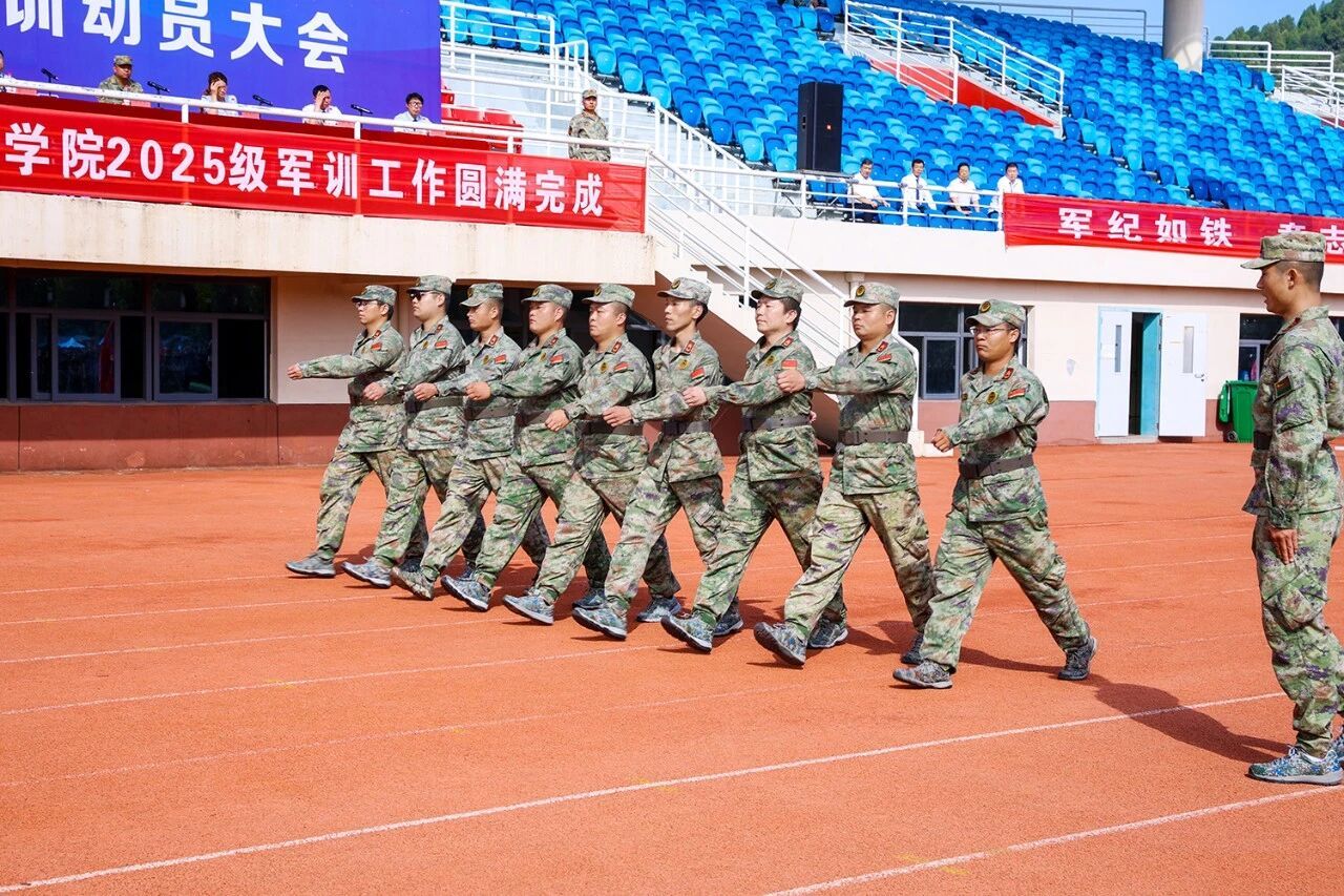大会现场还上演了一场精彩的队列展示。军训教官们身着整齐军装,精神抖擞地走上场地,立正、稍息、齐步走、正步走等动作标准划一,步伐铿锵有力,每一个转身、每一次摆臂都精准到位,充分展现了军人的过硬素质与良好风貌。精彩的展示赢得全场师生阵阵欢呼,也让新生们对后续训练充满信心。