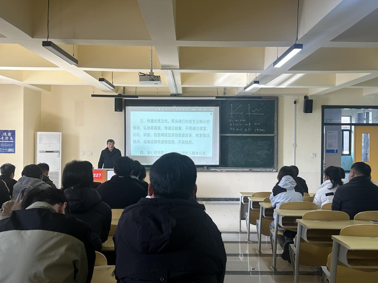 会议最后,沈院长带领全体教师共同学习了《新时代高校教师职业行为十项准则》。他强调,全体教师应自觉做到不造谣、不传谣,不发表或转发错误言论、不编造或散布虚假不良信息,恪守职业道德底线,坚持“顶天立地做人,踏踏实实做事”,共同营造风清气正、积极向上的育人环境。