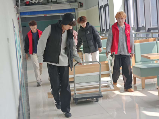 活动现场,志愿者们身着红色志愿马甲,分工协作、干劲十足。在图书馆工作人员的指导下,大家有条不紊地开展各项工作:志愿者们仔细核对书架编号,将错位的书籍逐一归位,对新书进行上架排序,确保藏书摆放规范、查找便捷;大家手持拖把、扫帚,对图书馆走廊、阅读区、卫生间等区域进行全面清扫,擦拭桌椅、清洁台面,让馆内环境焕然一新;志愿者们还协助搬运家具、规整阅览桌椅,为师生打造舒适、明亮的阅读空间。从书架间的俯身整理,到地面上的细致清扫,每一位志愿者都以饱满的热情投入服务,用实际行动诠释着“奉献、友爱、互助、进步”的志愿精神。经过数小时的忙碌,图书馆面貌整洁有序,书香氛围更加浓厚。