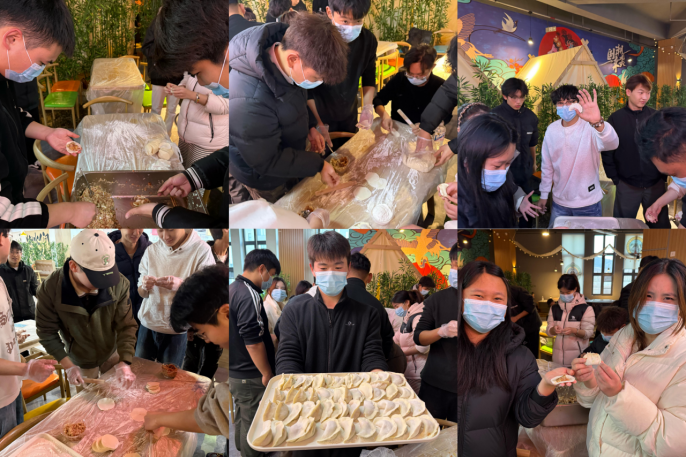 物料就绪,大家纷纷捋起袖子。案板前,师生协作流畅:这边飞快擀出圆润的饺子皮,那边指尖翻飞捏出精巧褶皱。元宝形、月牙形、小花边等各式新奇造型层出不穷。手作之间,大家聊起家乡的冬至习俗,分享校园里的趣事轶闻。面粉的清香与热闹的谈笑声交织,冬日的冷清就这样被悄然驱散。
