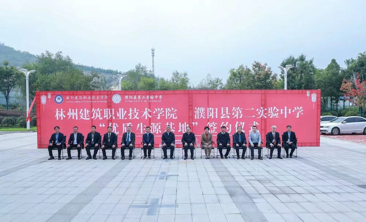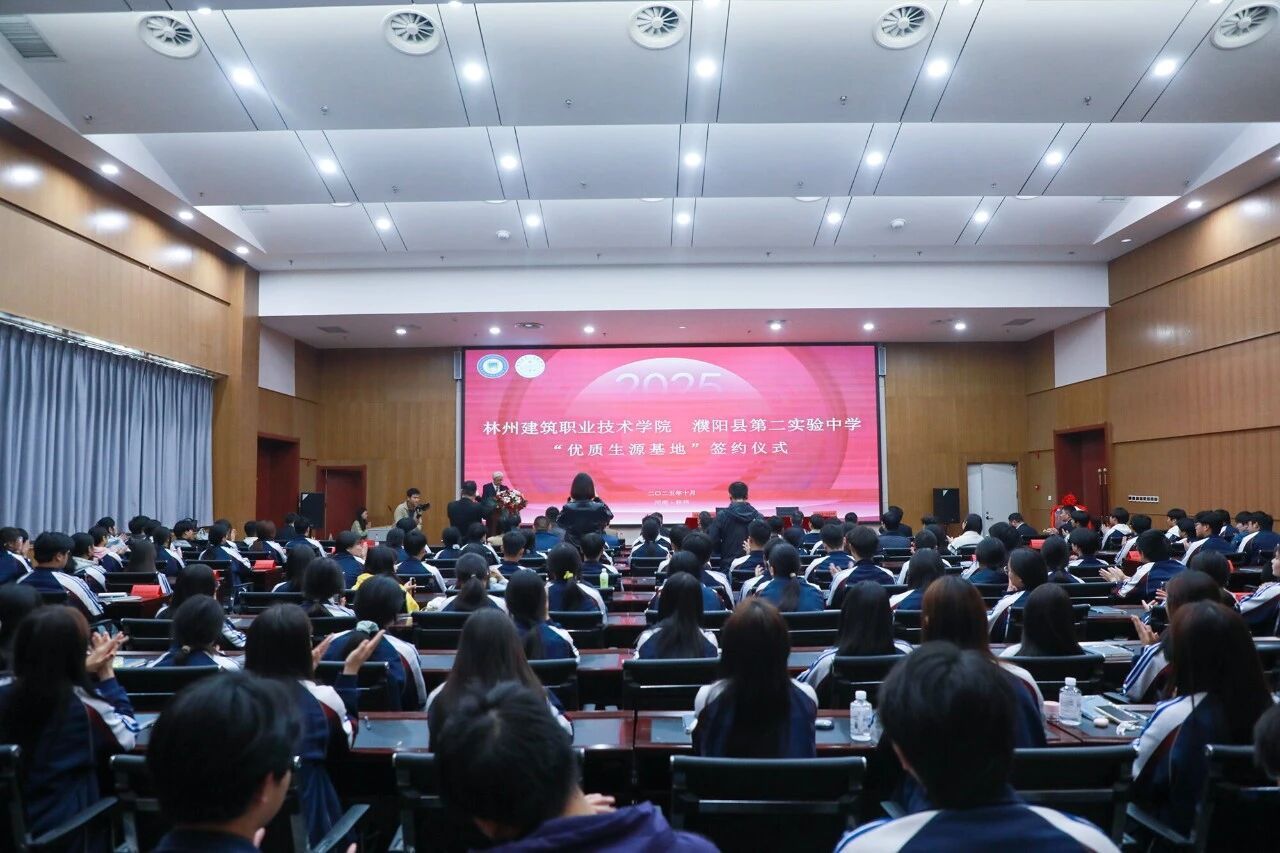 10月15日,林州建筑职业技术学院与濮阳县第二实验中学“优质生源基地”签约授牌仪式在林州建院隆重举行。这场跨越地域、贯通学段的教育协作,标志着豫北地区中高职衔接正式迈入“资源共享、人才共育”的新纪元,林州市教体局党组书记、局长范永清,濮阳县教育考试中心主任刘斌,濮阳县中心校校长李瑞斌,中原华信控股集团总裁、林州建筑职业技术学院理事长谷建光,濮阳县第二实验中学教育集团董事长蔡玉坤及两校全体校领导班子出席会议。签约仪式由林州建筑职业技术学院副校长李文山主持。
