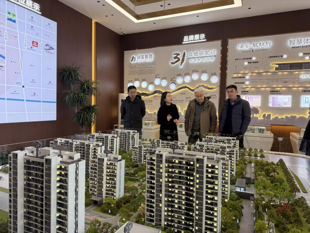 在润安集团董事长李庆祥的陪同下,李文山、李超杰一行先后参观了企业展厅与润安·玖玥府项目现场。在企业展厅,大家通过图文介绍与实物展示,详细了解了润安集团30余年的发展历程、多元化业务布局及在绿色建筑领域的创新成果。走进玖玥府建设现场,项目集成的光伏建筑一体化、智慧社区管理系统等前沿技术,让大家对智能建造的实际应用有了直观认知,高标准施工工艺与精细化管理模式也赢得一致赞誉。