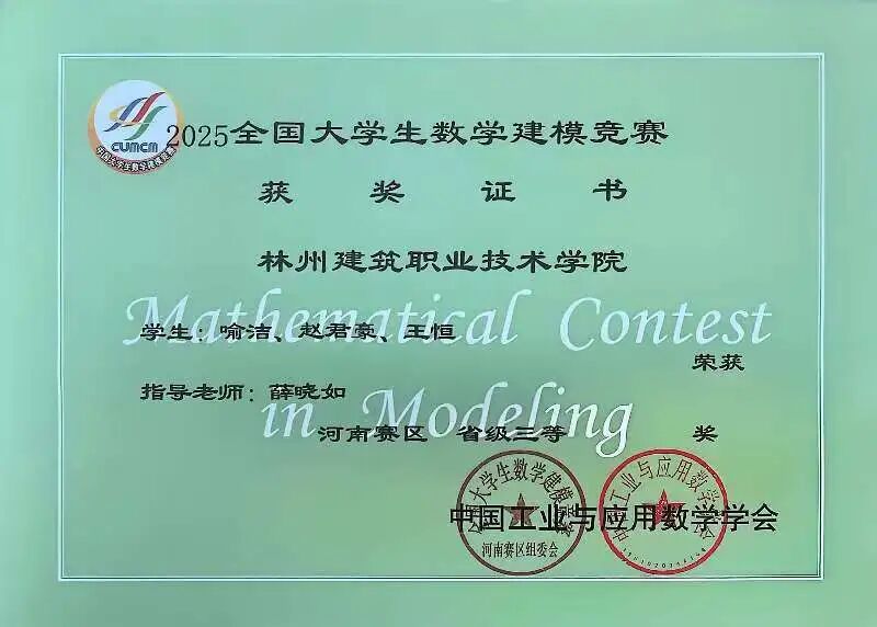 近日,2025年全国大学生数学建模竞赛成绩揭晓,林州建筑职业技术学院(以下简称“林州建院”)学子在此项被誉为中国高校规模最大的基础性学科竞赛中取得历史性突破,选派4支参赛团队,一举斩获国家级二等奖1项、省级二等奖1项、省级三等奖2项的优异成绩。这一佳绩不仅彰显了学子们的学习研究精神,更是学校深化教学改革、注重应用型人才培养的生动体现。