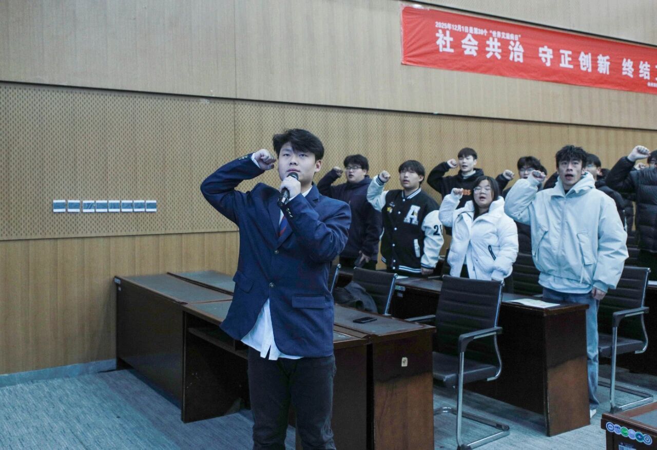 宣誓环节由学生代表李棚领誓。全体师生高举右拳,庄严承诺将从自身做起,积极学习并宣传防艾知识,消除社会歧视,主动承担社会责任,为遏制艾滋病传播、守护健康家园贡献力量。