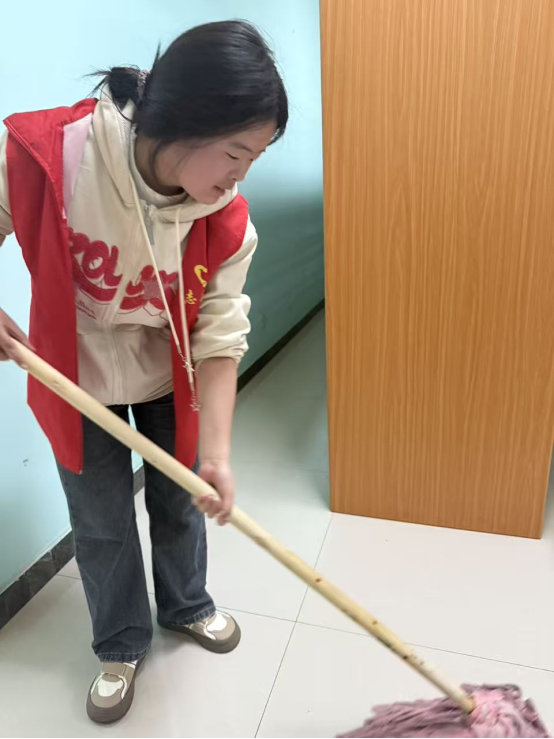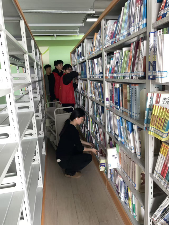 活动现场,志愿者们身着红色志愿马甲,分工协作、干劲十足。在图书馆工作人员的指导下,大家有条不紊地开展各项工作:志愿者们仔细核对书架编号,将错位的书籍逐一归位,对新书进行上架排序,确保藏书摆放规范、查找便捷;大家手持拖把、扫帚,对图书馆走廊、阅读区、卫生间等区域进行全面清扫,擦拭桌椅、清洁台面,让馆内环境焕然一新;志愿者们还协助搬运家具、规整阅览桌椅,为师生打造舒适、明亮的阅读空间。从书架间的俯身整理,到地面上的细致清扫,每一位志愿者都以饱满的热情投入服务,用实际行动诠释着“奉献、友爱、互助、进步”的志愿精神。经过数小时的忙碌,图书馆面貌整洁有序,书香氛围更加浓厚。