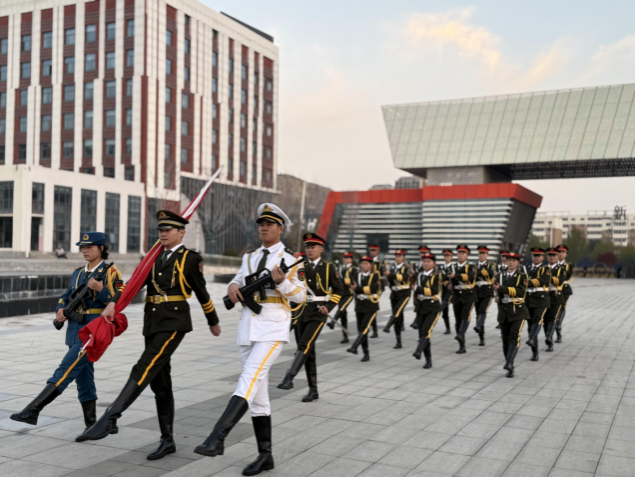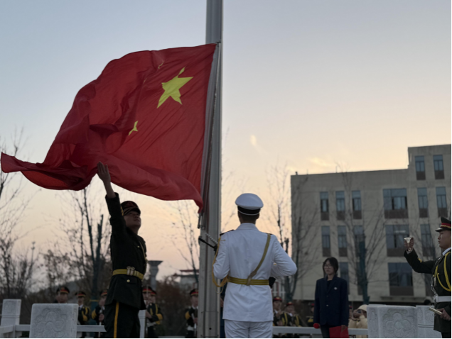 在全体师生的注目下,国旗护卫队步伐铿锵,护卫国旗庄严入场。伴随着雄壮的《义勇军进行曲》,五星红旗冉冉升起,迎风舒展。全体师生齐声高唱国歌,肃立致敬。青春意气与爱国情怀在晨光中交织升腾,为整场仪式注入了昂扬向上的精神力量。